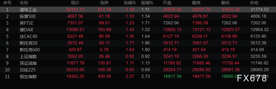 美股收盘情况:道琼斯工业指数上涨1.19%,至32151.71;标普500指数上涨1.53%,至4067.36;纳斯达克指数上涨2.11%,至12112.31。