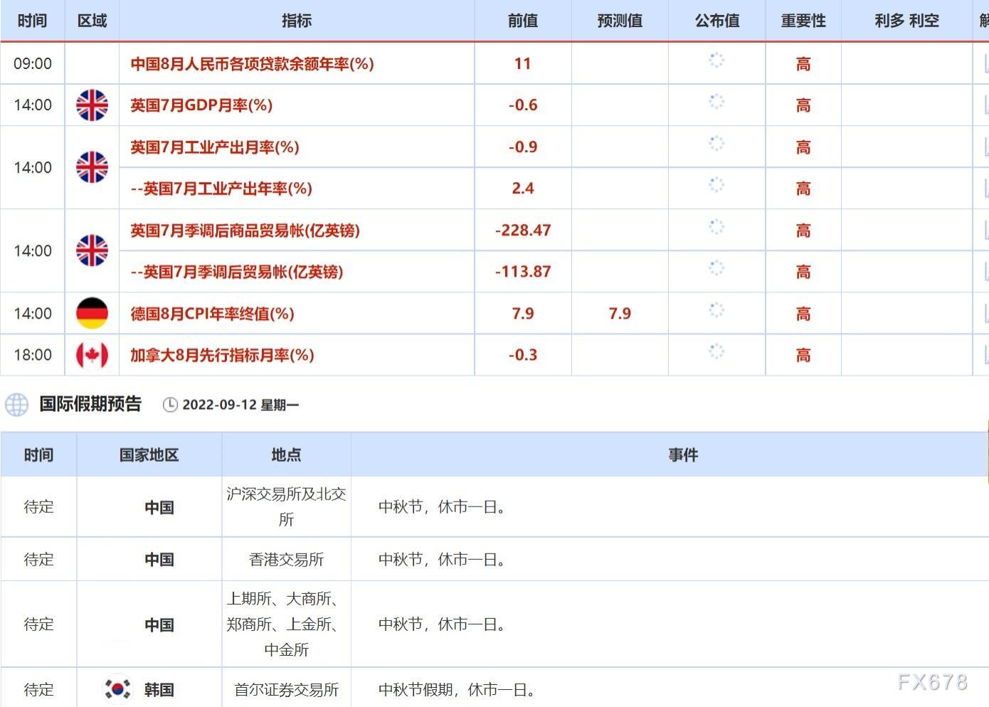 9月12日,中国和韩国的一些交易所因为中秋节假期休市,投资者需关注相关休市公告。