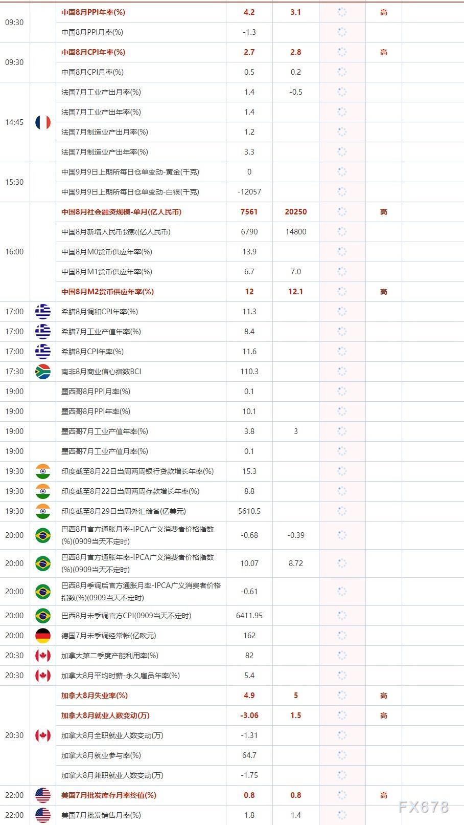 09:30 中国8月CPI年率(%) , 前值 2.7 , 预期值 2.8 , 公布值:待发布