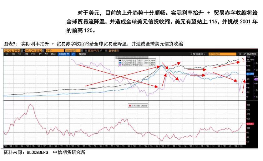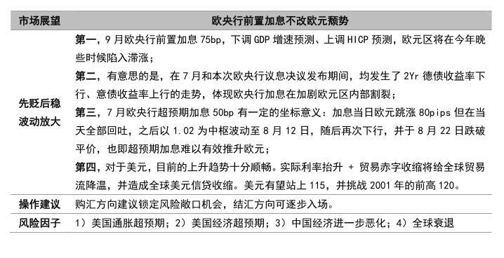 参考 7 月欧央行超预期加息经验,9 月的前置加息难以有效提振欧元。美国实际利率抬升、贸易赤字收缩将给全球贸易流降温,并造成全球美元信贷收缩,美元指数上行趋势非常顺畅,有望站上 115,并挑战 2001 年的前高 120。