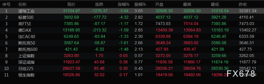 美股收盘情况:道琼斯工业指数下跌3.94%,至31104.97点;标普500指数下跌4.32%,至3932.69点;纳斯达克指数下跌5.16%,至11633.57点。