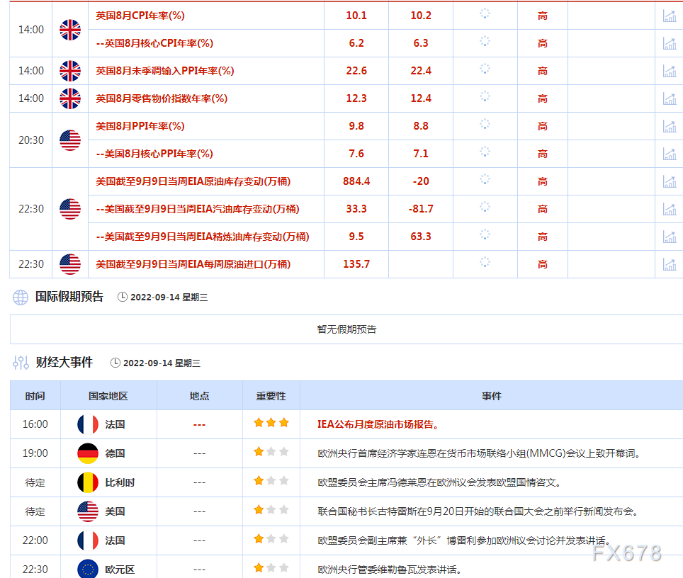 北京时间周三(9月14日)亚市早盘,美元指数交投于109.92附近;美元周二大涨1.5%,录得2020年3月以来的最大单日百分比涨幅,美国通胀数据强于预期,提振了投资者对美联储将需要继续激进加息的押注,金价回落;油价下跌,逆转了盘中早些时候的涨势,数据显示上周美国原油和馏分油库存增加,汽油库存下降。
