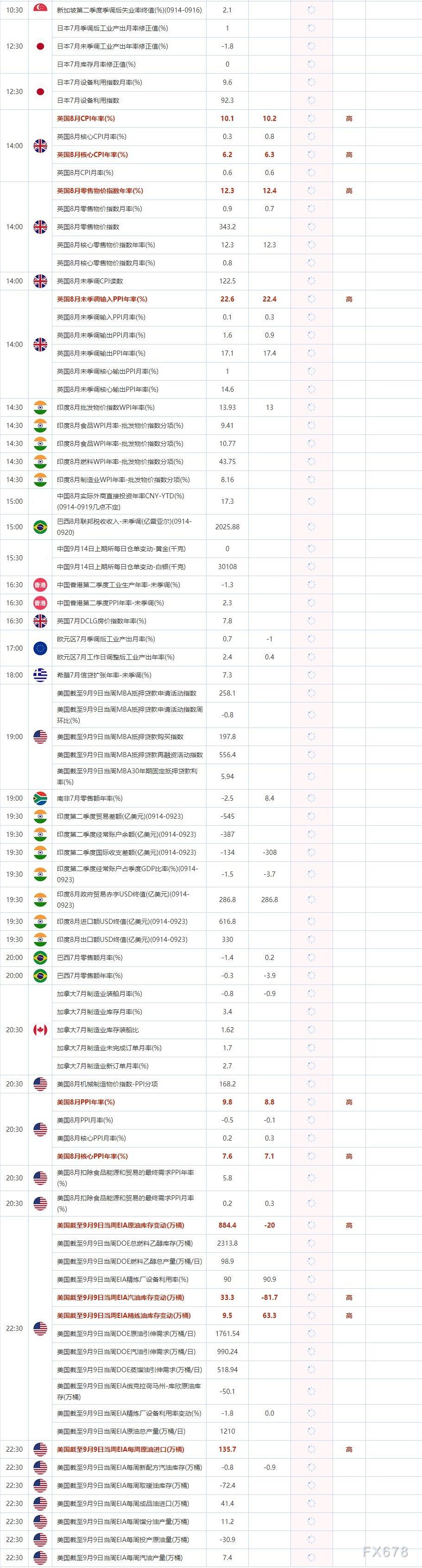 20:30 美国8月PPI年率(%) , 前值 9.8 , 预期值 8.8 , 公布值:待发布