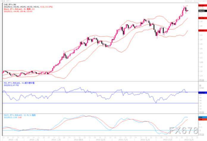 美元兑一篮子货币在近期强劲上涨后周一跌至两周多来的最低水平108附近,而美元兑日元自上周五出现高位获利回吐后,周一反而有所企稳。纽约联储的月度消费者预期调查显示,由于汽油价格从6月份的历史高点继续急剧下降 ,8月份美国消费者的通胀预期进一步下滑,这一进展可能会给美联储官员带来一些安慰,从而也就引起市场的猜测暨美国9月份的加息幅度会否减低。今晚将有美国8月通胀数据CPI公布,如果数据疲软,或会令美元兑日元进一步自高点回落。日线级别图上,美日在145水平处暂时构成重力压制水平,技术指标严重超买,但汇价目前还是处于短期均线上方;4小时图上,美日徘徊于142.00水平附近,RSI在均衡线附近,指向不明朗,若是跌穿142,下方的强支撑在140.00附近。