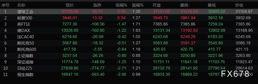 美股收盘情况:道琼斯工业指数上涨0.1%,至31135.09点;标普500指数上涨0.34%,至3946.01点;纳斯达克指数上涨0.74%,至11719.68。
