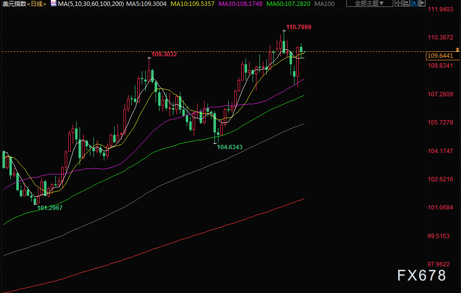 美元指数周三下跌0.1%,报109.71,此前一天录得2020年3月以来最大单日百分比涨幅,因美国消费者物价指数(CPI)意外上涨。