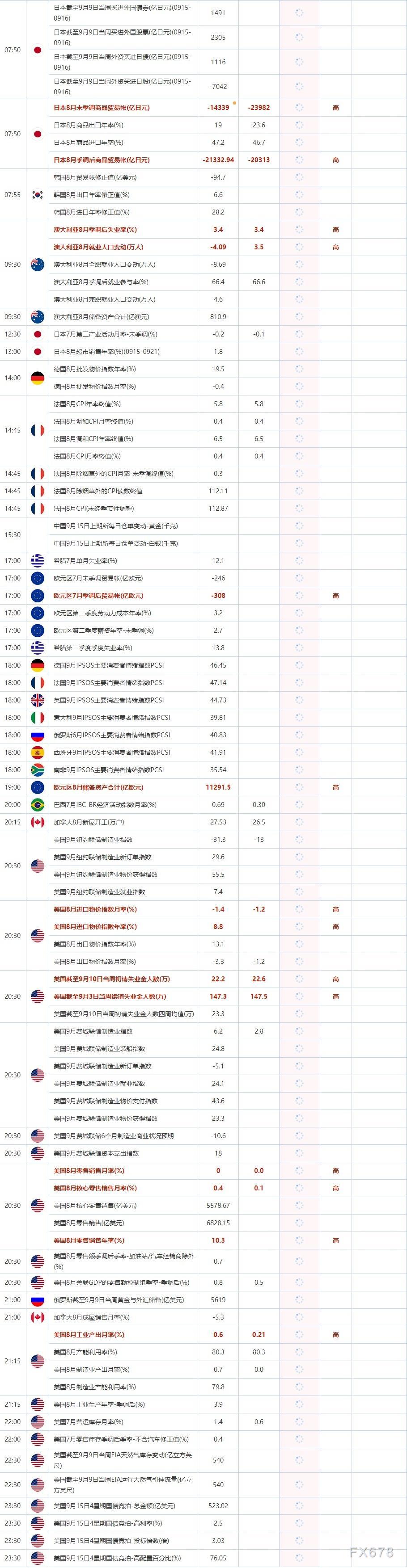 2022年9月15日,全球主要经济体将公布经济数据,需重点关注澳大利亚8月季调后失业率,欧元区7月季调后贸易帐,美国8月进口物价指数月率,美国截至9月10日当周初请失业金人数, 美国8月零售销售月率和美国8月工业产出月率。大事方面需关注:澳洲联储公布经济公报,欧洲央行副行长金多斯发表讲话。