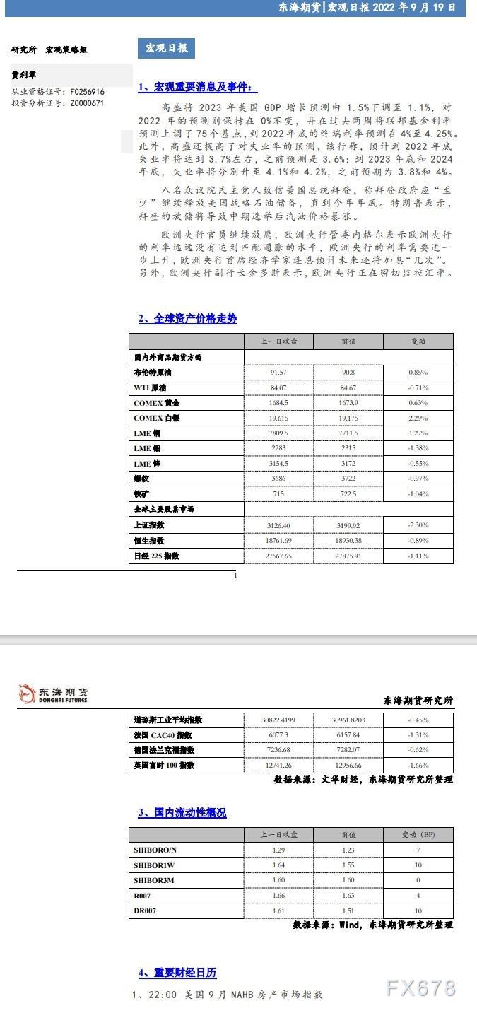 【东海期货9月19日宏观日报】欧央行继续放“鹰”,欧元短期反弹