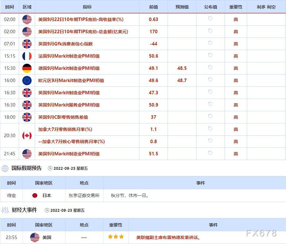 9月15日,欧洲央行副行长金多斯表示,欧元区经济增长将显着放缓,货币政策仍然宽松,预计今年和明年的通胀率将高得令人无法接受。他还表示,欧元区需要阻止物价的持续上涨。 9月19日,金多斯将发表讲话,投资者也需保持关注,以得知其最新观点。