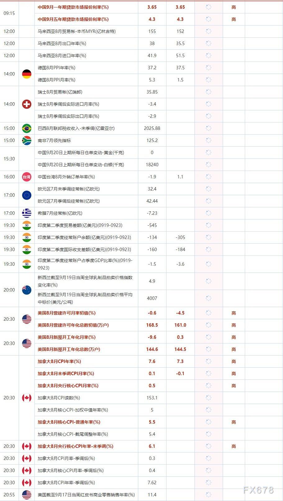 09:15 中国9月五年期贷款市场报价利率(%) , 前值 4.3 , 预期值 4.3 , 公布值:待发布