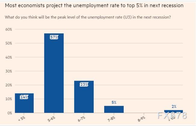 此外,57%的经济学家预计,美国失业率峰值可能会达到5%至6%之间,远高于目前3.7%的水平。此外近三分之一的人认为美国失业率峰值将超过6%。