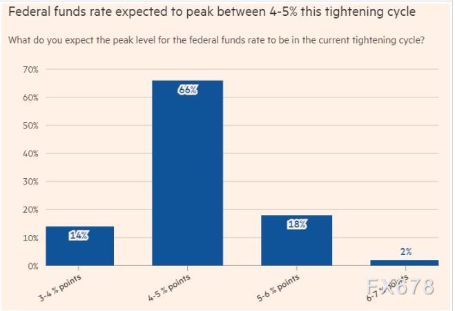 在9月13日至15日进行的调查显示,在美国44名知名经济学家中,近70%的人认为,在本轮紧缩周期中,美联储联邦基金利率将在4%至5%之间见顶,还有20%的人认为需要突破5%的水平。