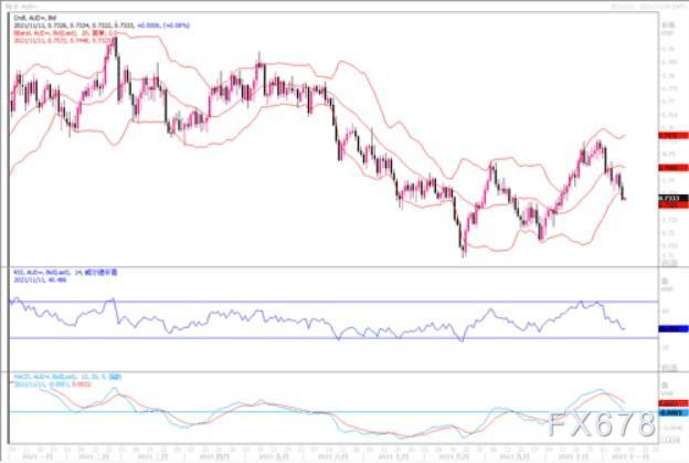 周四早间,澳洲统计局(ABS)公布澳洲10月份就业人数意外地减少46300人,预期增加50000人,失业率则从就月份的4.6%回升至5.2%,高于预期的4.8%。可以看到疫情发展中,新南威尔士以及维多利亚两周的封锁,对于经济的影响仍然较大。这就更可能削弱对于澳联储尽快进入加息行列的语气。澳元兑美元也随着其他主要非美货币继续处于下滑的状态之中。自昨日盘中跌破100日移动均线0.7386后,澳元兑美元加速跌向0.73。日线级别图上,汇价远在20日均线之下,各类技术指标均朝下发展,澳元兑美元下行态势明显,如果0.73心里关口失守,下一目标区域恐瞄向0.71附近。目前上方0.7380-0.7420区域的阻力较强。
