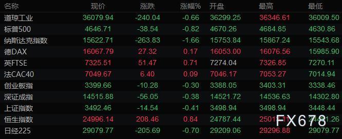 美股收盘情况:标普500指数下跌0.8%,报4646.71点;道琼斯工业平均指数下跌0.7%,报36079.94点;纳斯达克综合指数下跌1.7%,报15622.71点;纳斯达克100指数下跌1.4%,报15985.57点;罗素2000指数下跌1.5%,报2390.323点。