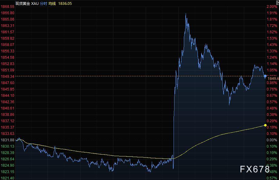 周三黄金攀升至近五个月来最高点,现货黄金一度上涨2%至每盎司1868.55美元,为6月以来最高水平;因数据显示上月美国消费者物价急升,增强了黄金作为通胀对冲工具的吸引力。不过随着美元大涨,尾盘金价涨幅缩窄,回落至1849.6美元/盎司。