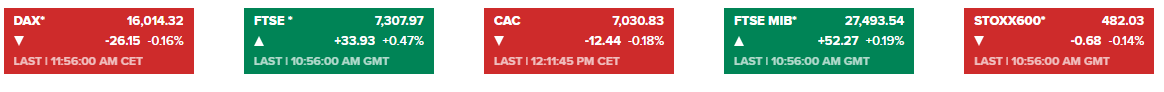 欧美股市:欧洲股市周三开盘谨慎走高,投资者消化了中国和德国通胀飙升的影响。在伦敦,富时100指数开盘后上涨0.4%,巴黎CAC指数上涨0.1%,法兰克福DAX指数持平。截至发稿,欧洲股市主要股指走势如下图所示: