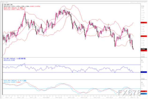 11月11日英镑兑美元一度刷新2021年以来的最低水平1.3358。英国国家统计局公布的数据显示,英国经济在9月份增长0.6%,但前几个月的估值被修正得更低,使得国内生产总值(GDP)比英国进入第一次新冠封锁前不久的2020年2月萎缩0.6%。英国经济在7-9月期间增长了1.3%。这标志着从上一季度报告的5.5%的增长急剧减速,比预期的1.5%还要糟糕。在11月的政策会议上,英国央行将其指标利率维持在0.1%不变,此前曾暗示可能提高利率,结果令市场相当失望。市场现在预计12月升息的可能性很高,但仍存在较高的不确定性。此外,英国制造业和工业生产数据也低于共识估计,人们还担心英国政府将触发《北爱尔兰协议》第16条,这些因素的组合对英镑起到了不利作用。与此同时,日内汇价的突然下跌可能归因于1.3400整数以下的一些技术性抛售,而盘中的技术超卖帮助英镑兑美元从日波动低点迅速反弹。即便如此,风险仍然偏向看跌,任何上涨或都将被视为卖出的机会。上方阻力位关注1.3433、1.3486、1.3557,下方支撑位关注1.3364、1.3312、1.3225。