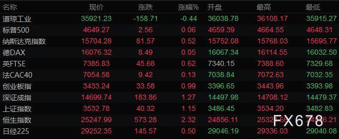 美股收盘情况:标普500指数上涨不到0.1%,报4649.27点;道琼斯工业平均指数下跌0.4%,纳斯达克综合指数上涨0.5%,纳斯达克100指数上涨0.3%,罗素2000指数上涨0.8%。