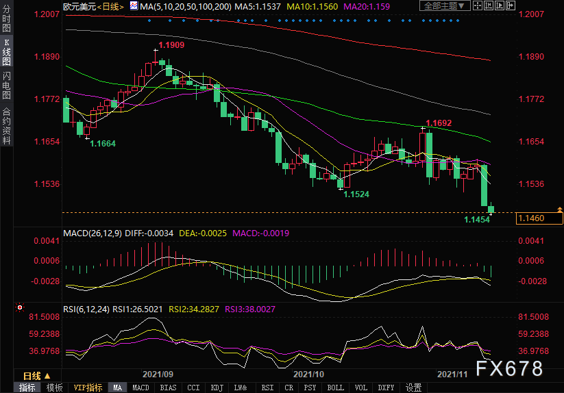 周三1.0%的下跌实际上是过去两周内欧元兑美元第二次下跌(10月29日欧元兑美元也下跌了1.0%)。尽管如此,这还是创下了自6月份以来的最大跌幅。下行路上,下一个关键支撑区是2020年6月10日高点约1.1422。