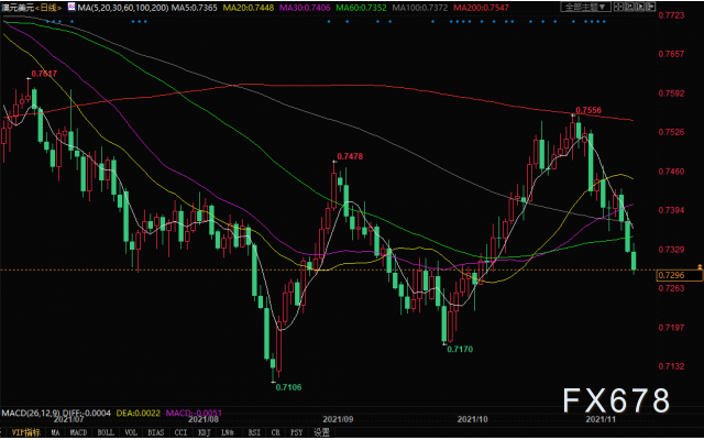 北京时间11月11日19:25,澳元兑美元报0.7296/98