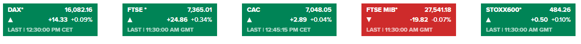 欧美股市:Yahoo finance报道指出,伦敦基准指数周四上涨,尽管英国第三季度GDP低于预期。受英镑疲软的推动,富时100指数开盘后上涨了0.3%,巴黎CAC指数上涨0.1%,德国DAX指数也上涨了近0.1%。截至发稿,欧洲股市主要股指走势如图所示: