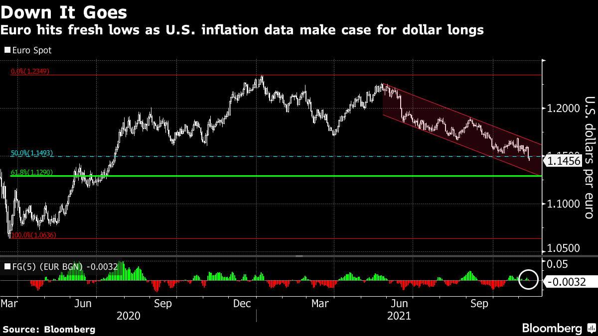 由于市场对美国通胀飙升的担忧波及欧洲外汇市场,英镑和欧元跌至去年以来的最低水平。周五欧元兑美元跌破16个月前水平至1.1450,英镑兑美元跌破1.34,为去年12月以来最低。