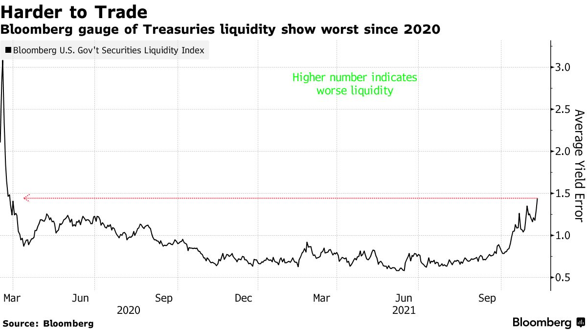 这一点在上周显现了出来,当时彭博的美国政府证券流动性指数——衡量收益率偏离公允价值模型的程度——显示情况是自2020年3月以来最糟糕的。