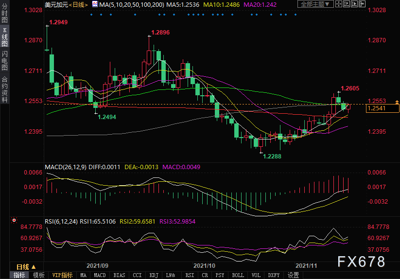 周二(11月16日)美元兑加元探底回升,在过去一小时触及盘中高点1.2544。