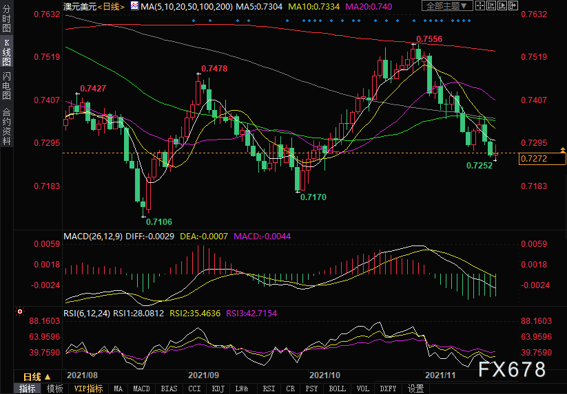 但从澳元兑美元的中短期前景来看,技术面继续看空。自10月底以来,澳元兑美元一直在下行趋势通道内下跌。本周开始,澳元兑美元测试并受阻于下行通道顶部阻力位。任何回升至0.7300上方都可能被视为卖出机会。