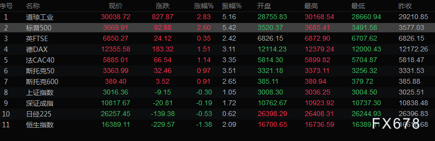 美股收盘情况:道琼斯工业指数攀升2.83%,报30,038.72点;标普500指数跳涨2.60%,报3669.91点;纳斯达克指数收高2.23%,报10649.15点。