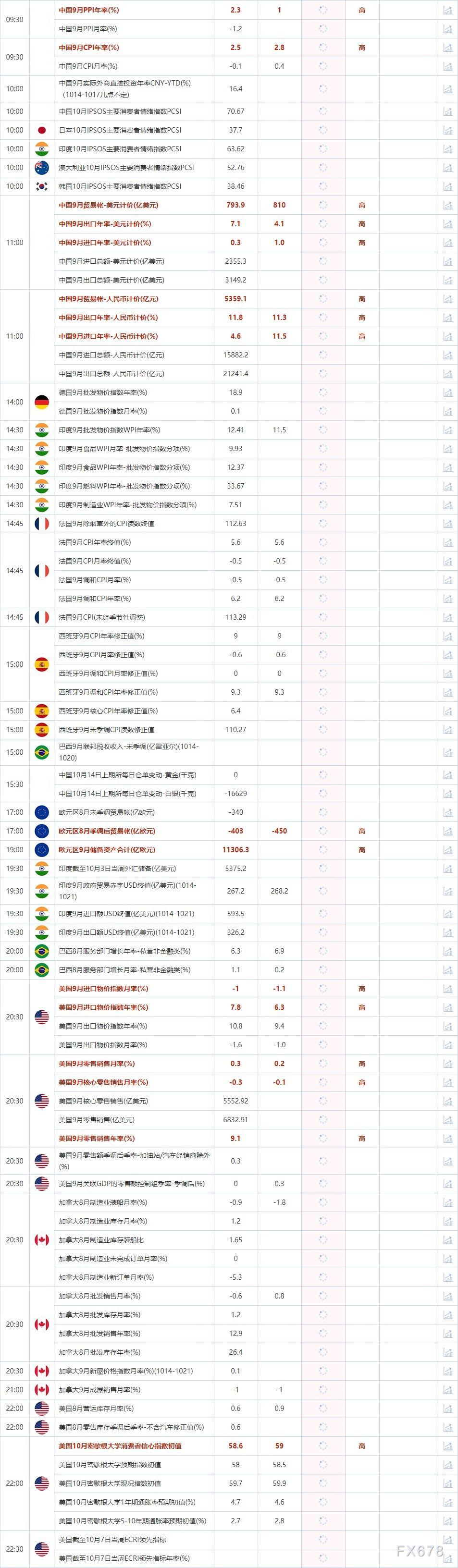 2022年10月14日,全球主要经济体将公布经济数据,需重点关注中国9月CPI年率,中国9月PPI年率,欧元区8月季调后贸易帐,中国9月贸易帐-美元计价,美国9月进口物价指数月率,美国9月零售销售月率。大事方面需关注: 堪萨斯联储主席乔治就美国经济前景发表讲话,美联储理事丽莎·库克就经济前景发表讲话。