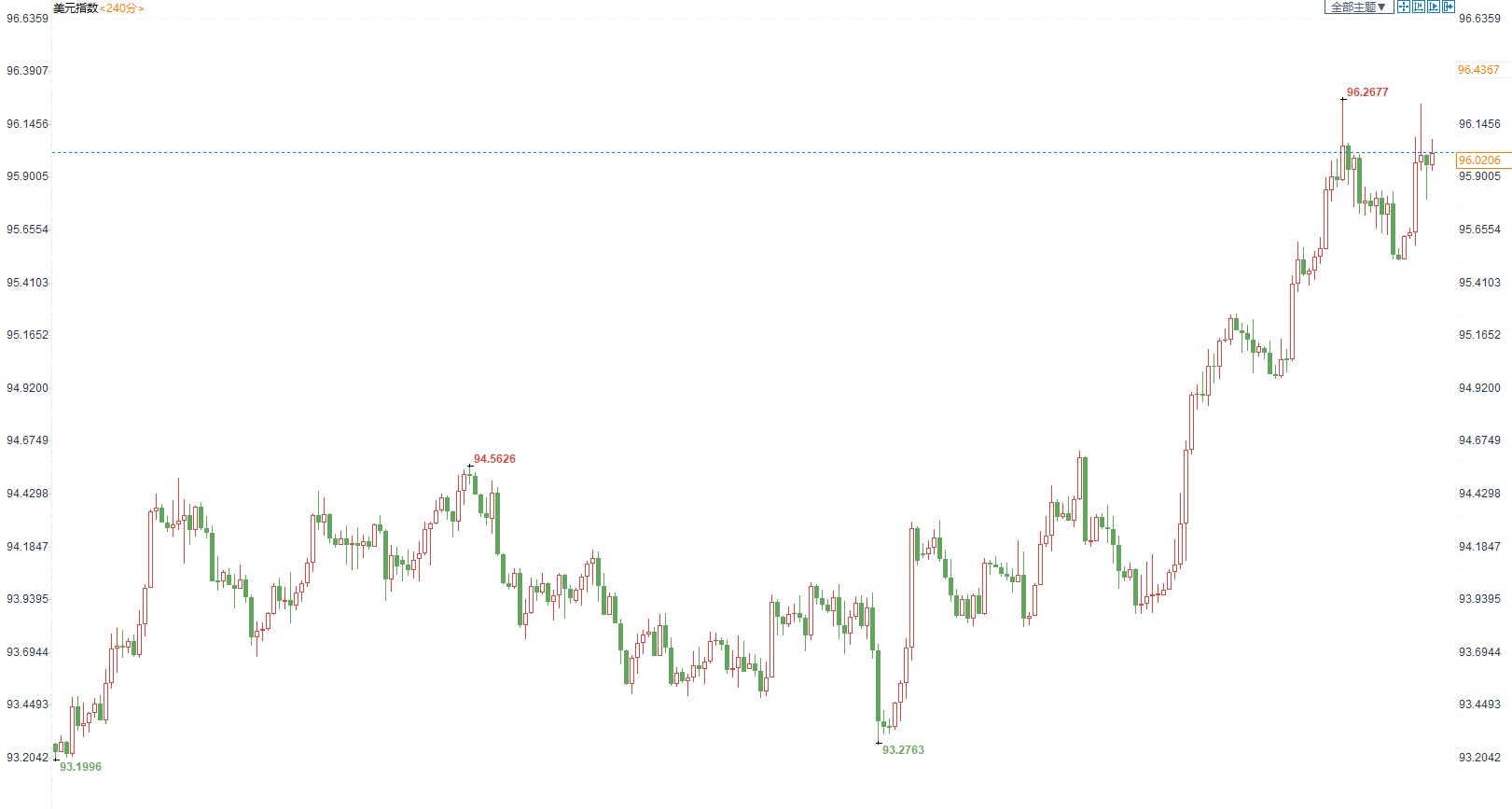 周六(11月20日)当周美元指数维持震荡走高的走势,当周美元指数上涨90点,涨幅0.95%。美联储提前加息预期不断升温,且其他央行紧缩预期并不强,这导致美国和主要经济体央行的政策差异不断增大,这支持美指走高。