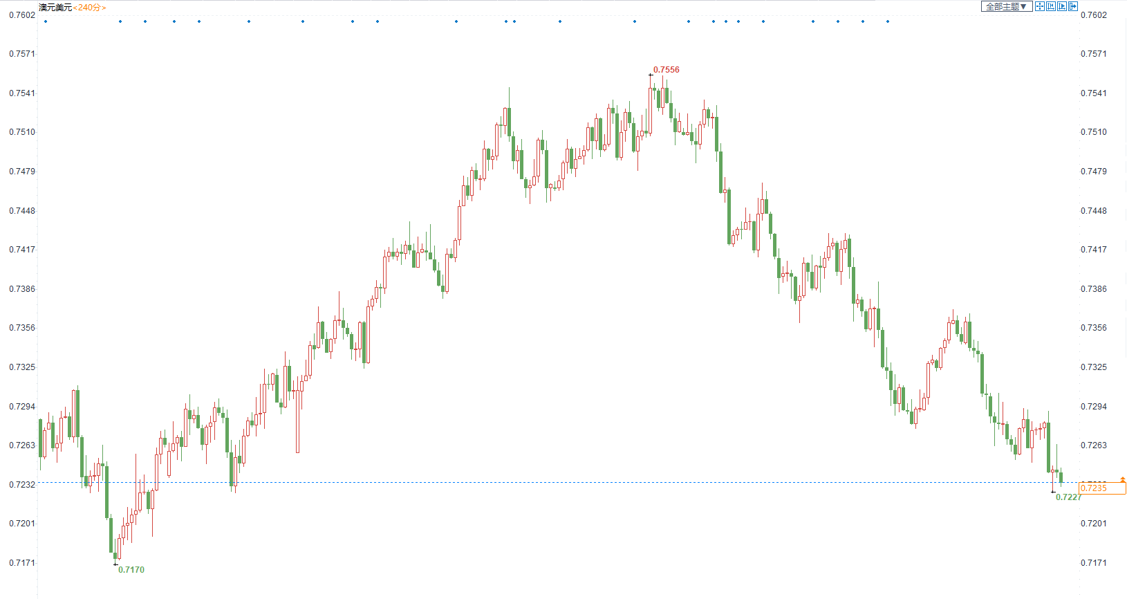 澳元兑美元本周震荡回落,受累于强势美元,澳洲联储比市场预期的相对鸽派的基调给澳元压力
