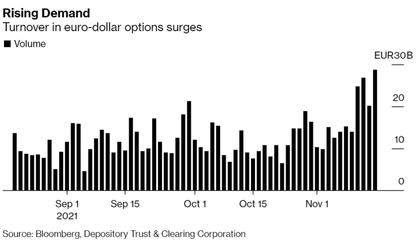 对看跌期权和奇异期权的需求推动了平值期权的波动率跃升至数月以来的最高水平,并暂时将一个月期的期权波动率推升至2020年5月以来最看跌欧元的水平。