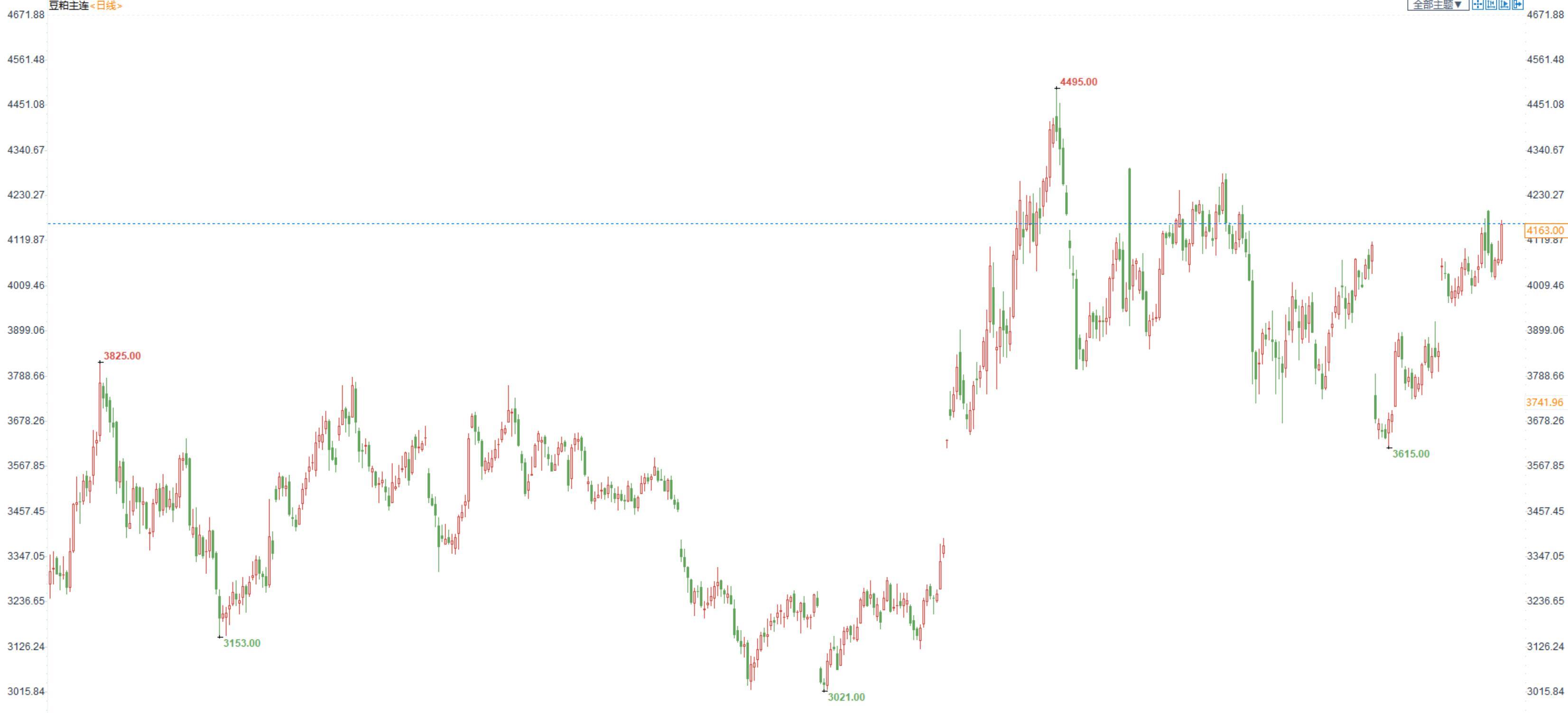 豆粕2301合约日内涨2.08%,收盘价4163元/吨,现货张家港43%蛋白豆粕5470元/吨。
