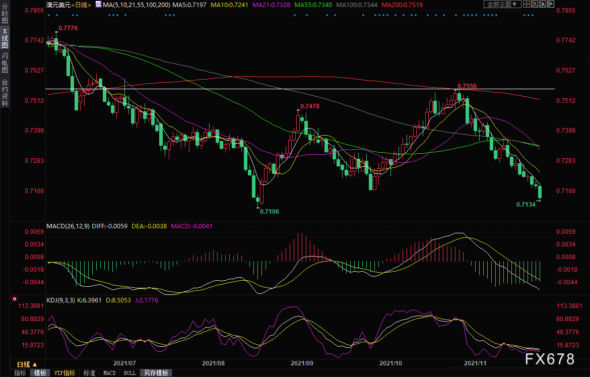 商品货币普遍受到拖累,澳元兑美元一度下跌0.78%,创近三个月新低至0.7134;纽元兑美元也创下三个月新低,最低触及0.6816,跌幅约0.5%。