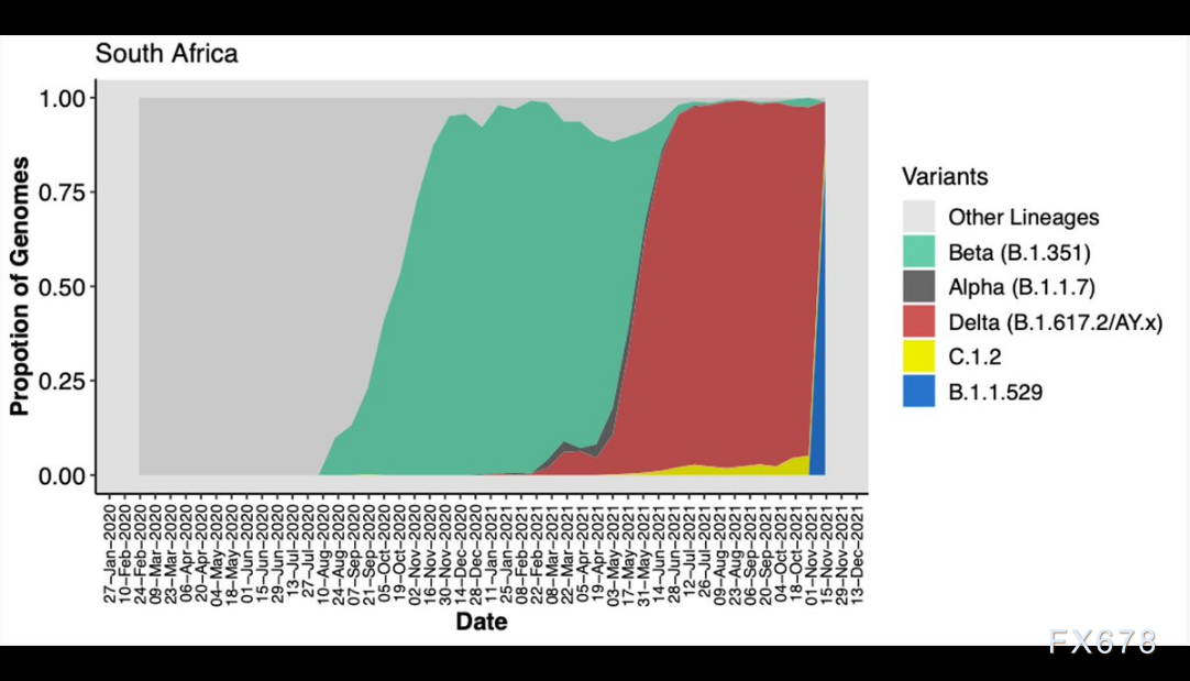 南非发现一种名为B.1.1.529的新变种新冠病毒,令当地官员忧心忡忡。新的变种病毒可能会在许多国家助长疫情,造成卫生系统承压,可能使重新开放经济和边境的努力更加复杂,全球市场周五(11月26日)因此爆发一波避险浪潮。