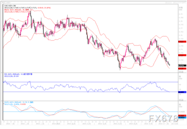 周四澳元/美元跌至9月30日以来的最低水平 0.7179,连续两日维持在这一低水平附近。亚市澳元/美元维持处在卖压当中,承压于股市疲弱且澳大利亚经济数据疲弱。三季度私人资本支出收缩 2.2%,低于期值 -2%。由于正值感恩节周末,日内交易料较为平静。澳元/美元日图走出更低的高位和更低的低位,维持一种抛售状态当中。日图显示,20均线向下穿越 100均线,两条均线汇合于 0.7340 附近,技术指标处在超卖附近,相对强弱指标朝下,动能指标持平。4 小时图显示澳元/美元风险仍偏下行,汇价维持处在持稳看跌的20移动均线下方,20均线处在大级别均线下方。技术指标持平于负区,表明市场维持平静,而不是暗示看跌耗尽。若澳元/美元跌破 9 月月度低点 0.7169,则看跌情况可能会更加坚挺,下方目标瞄向0.71。