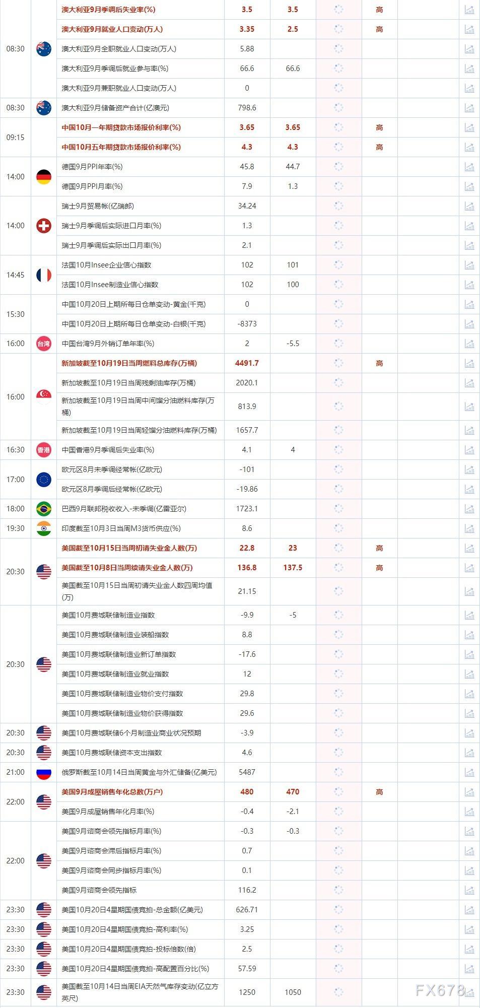 2022年10月20日,全球主要经济体将公布经济数据,需重点关注的数据包括澳大利亚9月季调后失业率,美国截至10月15日当周初请失业金人数,以及美国9月成屋销售年化总数。大事方面需关注:英国央行副行长布罗德班特就通胀发表讲话,欧盟举行领导人峰会。