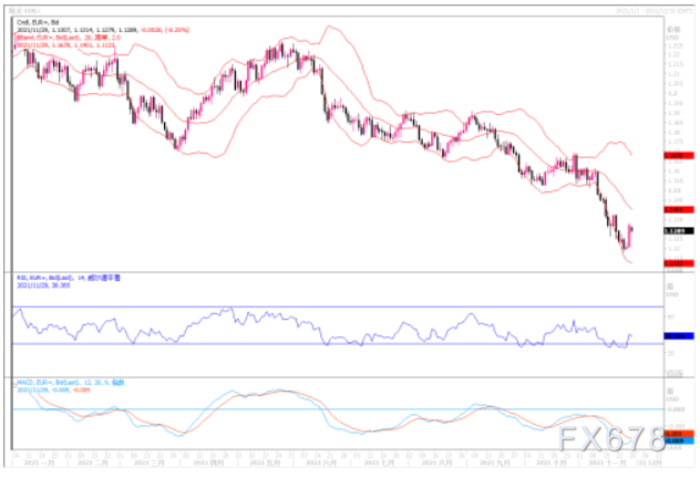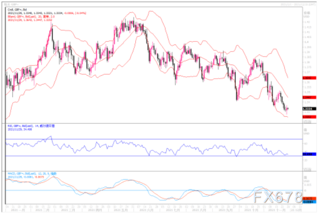 欧元在本月遭受重创,因为欧洲本将成为唯一一个要实施封锁措施的地区,但现在,由于出现新变异毒株,对再次实施旅行限制的担忧正在世界各地蔓延。市场已经在押注全球政策制定者将放慢加息步伐。这可能会缓解欧元跌势,因此前市场预计其他央行加息的速度远快于欧洲央行。市场人气的变化促使欧元在周五走高。如果市场继续修正对明年美联储的加息预期,预计欧元兑美元暂时稳定在1.12 -1.14之间。技术图形上,小时图上欧元出现超卖反弹,日线图上各类技术指标均处在超卖状态,存在调整之需。如果上方能冲破1.1330,则调整反弹之势或能带动欧元兑美元向1.15靠拢。但整体欧元的跌势未出现改变之态。