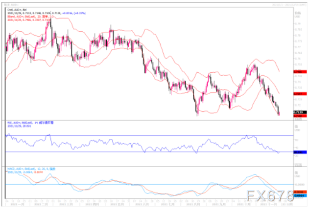 市场维持避险情绪,澳元/美元上周五暴跌至 0.7112,随后自该水平温和反弹至 0.7140 价格区域。自 10 月 29 日触及 0.7555 高点以来,澳元/美元维持疲弱。澳元/美元连续四周下跌,未出现见底信号。周图显示,澳元/美元已跌破 100 和 200 SMA,均汇合于 0.7200 附近。相对强弱指标处在超卖,维持朝下,而动能指标处在中线附近,方向不明。日图表明,尽管澳元/美元处于超卖,但随着技术指标稳步向下,汇价仍存在测试更低的低点趋向。同时,继跌破同样看跌的100均线后,20均线加速朝下,所有这些信号表明卖盘力量较盛。澳元/美元今年触底于支撑位 0.7105,若澳元/美元跌破该水平,将测试 0.7000关口。短线小时图上,超卖严重,存在区间调整的机会,料近期将在0.71-0.72的区间内整固。