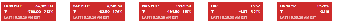 由于担心病毒新变种可能放缓经济增长并再次限制人员流动,油市与其他金融市场同步下跌。欧美股市:周四欧洲股市暴跌,美国股指期货跌幅持续扩大,截止发稿,美股期货走势如图: