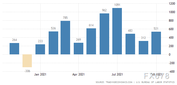数据显示,美国10月新增非农就业人口53.10万,高于预期的增加45万,前值从增加19.4万上修至增加31.2万;美国10月失业率录得4.60%,分别低于预期值0.1个百分点和低于前值0.2个百分点。不过美国10月劳动参与率不及预期0.1个百分点,持平前值61.60%。