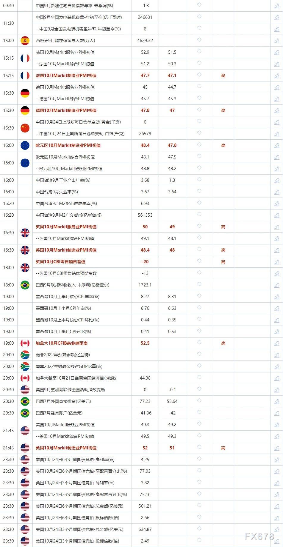 2022年10月24日,全球主要经济体将公布经济数据,需重点关注德国、法国、英国、美国和欧元区10月Markit制造业PMI初值,英国10月CBI零售销售差值,以及加拿大10月CFIB商业晴雨表。 大事方面需关注: 英国保守党进行第一轮党魁候选人投票。此外,印度和新西兰证券交易所因为节日休市一天。