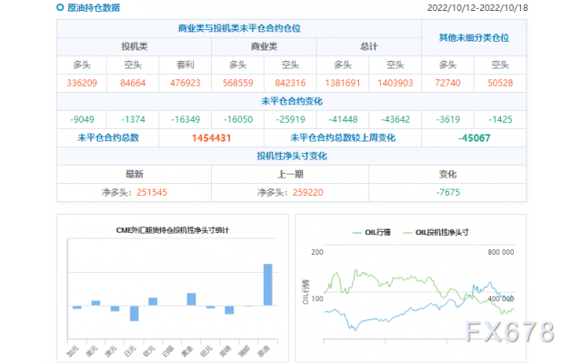 能源类持仓:截至10月18日当周,投机者所持布伦特和WTI原油净多头头寸减少52262手至356726手合约。其中WTI原油净多头头寸下降32616手至176050手合约。NYMEX天然气净多头头寸降至31843手合约,创最近逾两年新低。