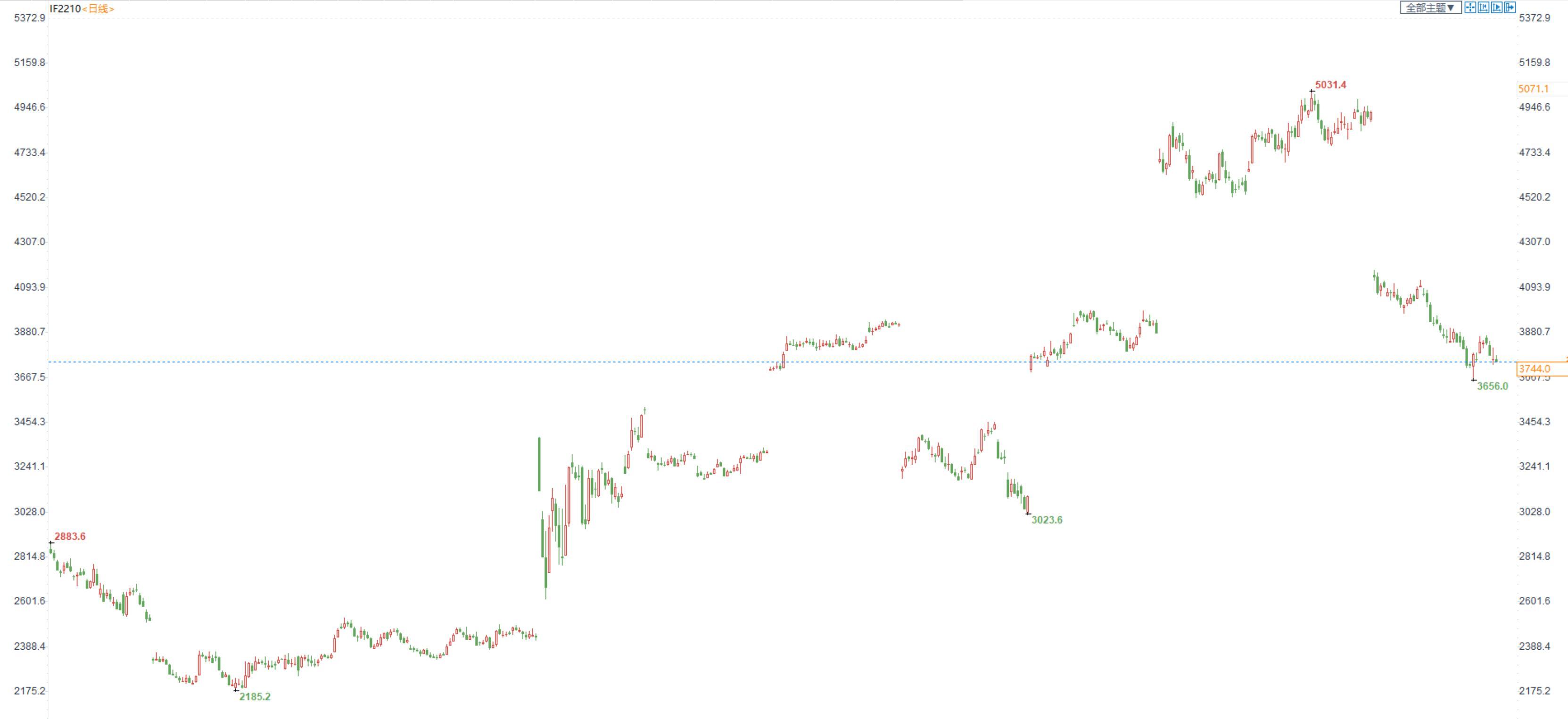 【今日行情】四大期指涨跌互现。IH2210收盘价为2487.8,收跌0.59%,盘中再创新低;IF2210收盘价为3744,收跌0.41%;IC2210收盘价为5965.2,收涨0.06%;IM2210收盘价为6440,收跌0.05%。今日市场继续分化,早盘在中证金融下调转融资费率0.4%并同步启动市场化转融资业务试点的利好影响下,市场有所拉升,但午后IH和IF明显走弱,IM和IC表现较为抗跌,全天震荡为主。成交额缩至7133.13亿元,量能连续4个交易日处于8000亿元下方,量能起不来的话,短期市场向上驱动不足。