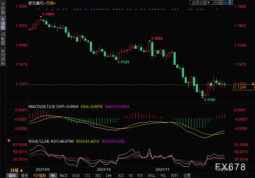 周一(12月6日)欧元兑美元自欧洲时段早盘低点迅速反弹数点,目前仅小幅下跌,位于1.1300关口附近。