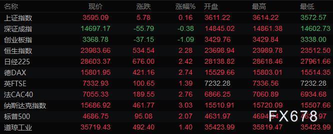 美股收盘情况:标普500指数上涨2.1%,报4686.75点;道琼斯工业平均指数上涨1.4%,报35719.43点;纳斯达克综合指数上涨3%,报15686.92点;纳斯达克100指数上涨3%,报16325.66点;罗素2000指数上涨2.3%,报2253.788点。