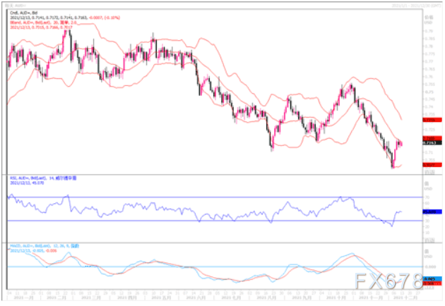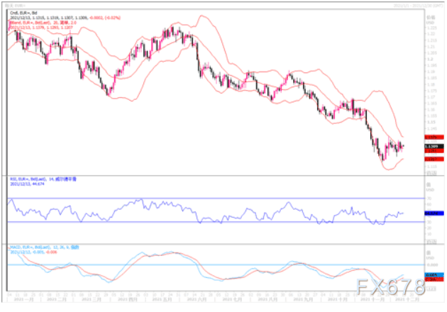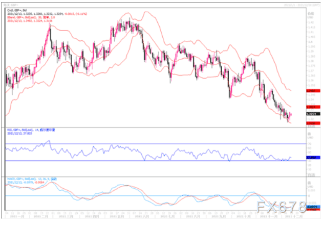 由于GDP下滑,英镑兑美元走软。英国经济10月份环比仅增长0.1%,而预期中值为0.4%,原因是建筑产出大幅下降,而制造业活动在供应短缺的情况下表现平平。这样一来,可能加深投资者认为英国央行本周将会维稳。鉴于央行行长桑德斯本周稍早表示,他可能更愿意等待奥密克戎方面的更多证据,然后再改变政策,该行可能甚至会一致投票支持维稳。在技术图形上,日线图上的技术指标钝化严重,MACD信号线有形成金叉迹象,RSI自超卖区域略显上扬。若本周美联储利率会议没有太惊人的表态,则英镑兑美元或可获得一定的上升牵引力。但是,英镑若要扭转颓势,上方必须突破1.34之上,方可看到明确的走势方向。