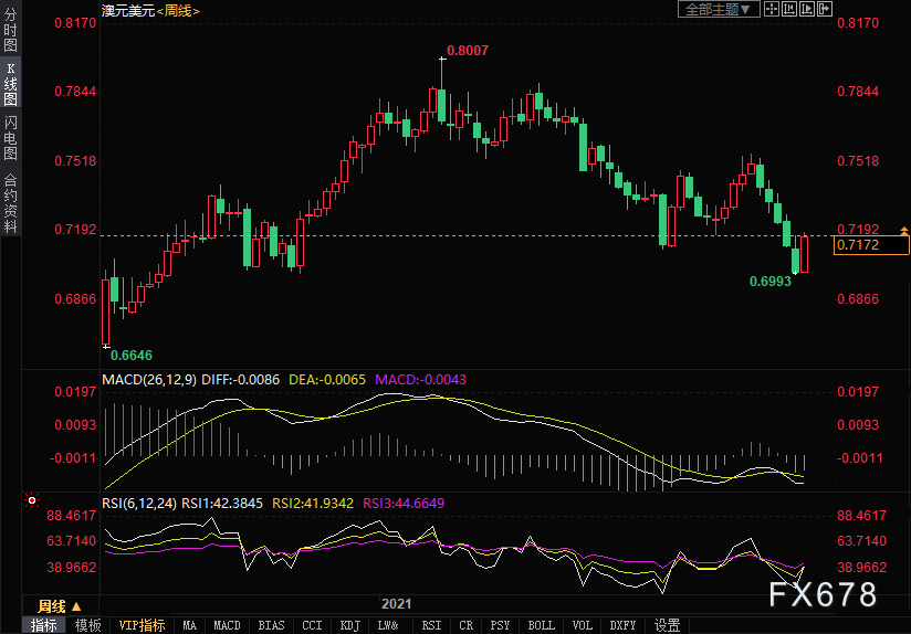 澳元本周大涨2.44%至0.7172,结束此前五连跌,主要受到市场风险情绪升温的提振。